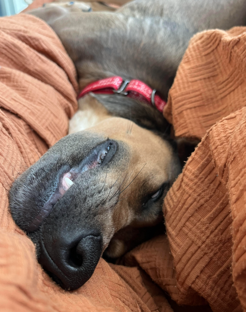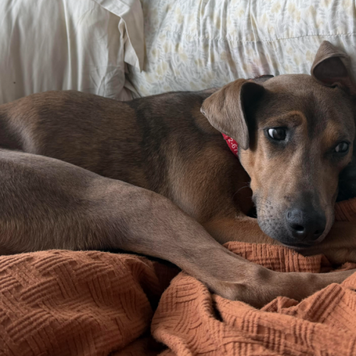 I don’t like loud noises or crowds and I can be unsure about strangers. The good news is that I warm up to new people as soon as I can get a couple of sniffs in to make sure they pass the vibe check, and I 100% love my people. I take my job as protector of the pack seriously, and have been known to bark at incoming threats (like squirrels). My foster mom calls me the guard dog of the apartment, and I take that job seriously. That also means that I don’t love being left home alone, because how am I supposed to take care of her if she’s leaving me behind? That said, I’m working hard to get more comfortable with my crate, and my foster mom thinks I’m making great progress.