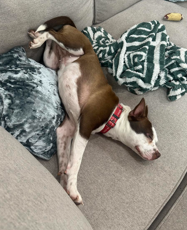 I’m a perfect mix of ‘life of the party’ and ‘lets chill’. When I first come out of my crate after a nap, I’m raring to go! I love to greet my humans with my special jumping bean routine, and then run around and play with my toys! My foster family says I’m great at entertaining myself, and if everyone in the house is working, I’m content to play with my toys by myself. Once I’ve played for a while, I like to settle down and nap. I’m a champion napper, and am great at finding all the coziest spots!