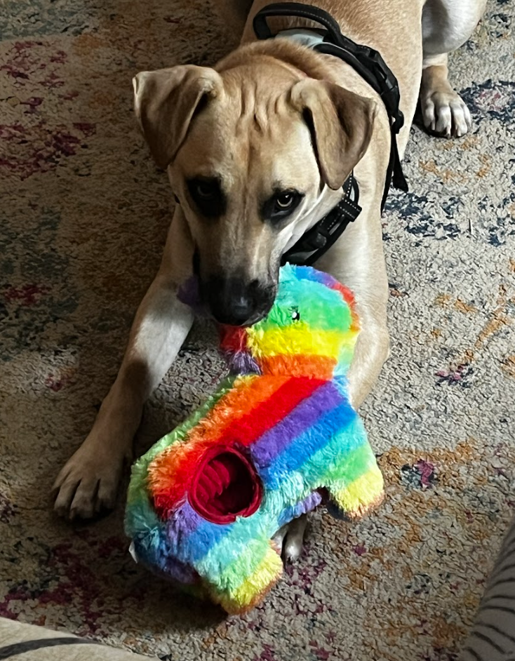 My other most favorite thing are toys! Squishy or squeaky ones are obviously top tier, but my absolute favorites are toys where the little squeaky stuffies are hidden inside a bigger stuffie! Those extra surprise ones are premium. I like to shove my nose inside to find all the hiding squakers, and carry my new-found treasure all around the house to show off to my foster family! They’re always very impressed with my finding skills!